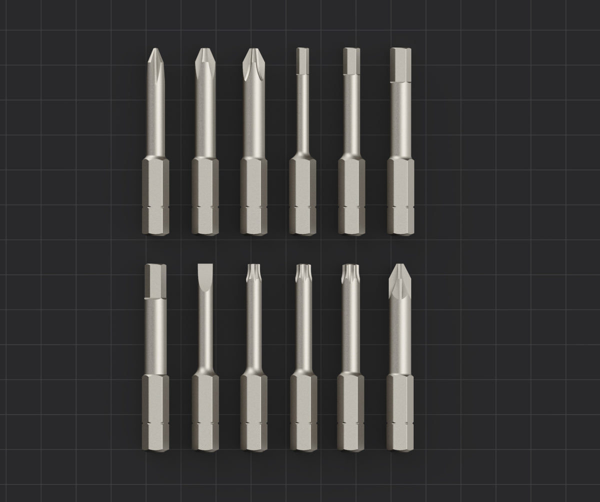 В набор входят отвертка и 12 бит: SL4, PH1, PH2, PH3, PZ2, T15, T20, T25, H3, H4, H5, H6. Это универсальный комплект для работы с различными типами крепежа.