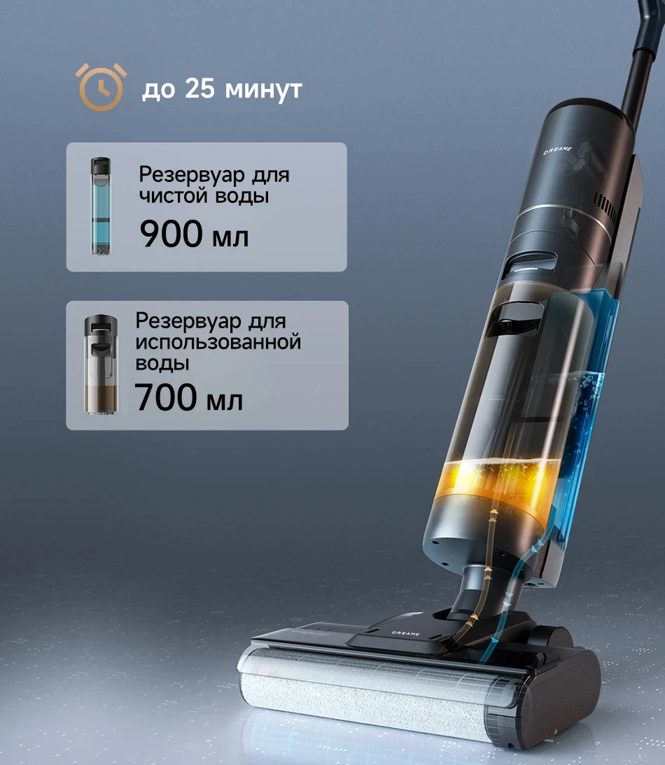 Пылесос Н12S оснащен двумя вместительными резервуарами для воды, что позволяет оптимизировать время уборки и обеспечить эффективную и бесперебойную работу. Наряду с мощным аккумулятором емкостью 6*2500 мАч это позволяет выполнять уборку в течение 25 минут для поддержания чистоты и порядка в доме.