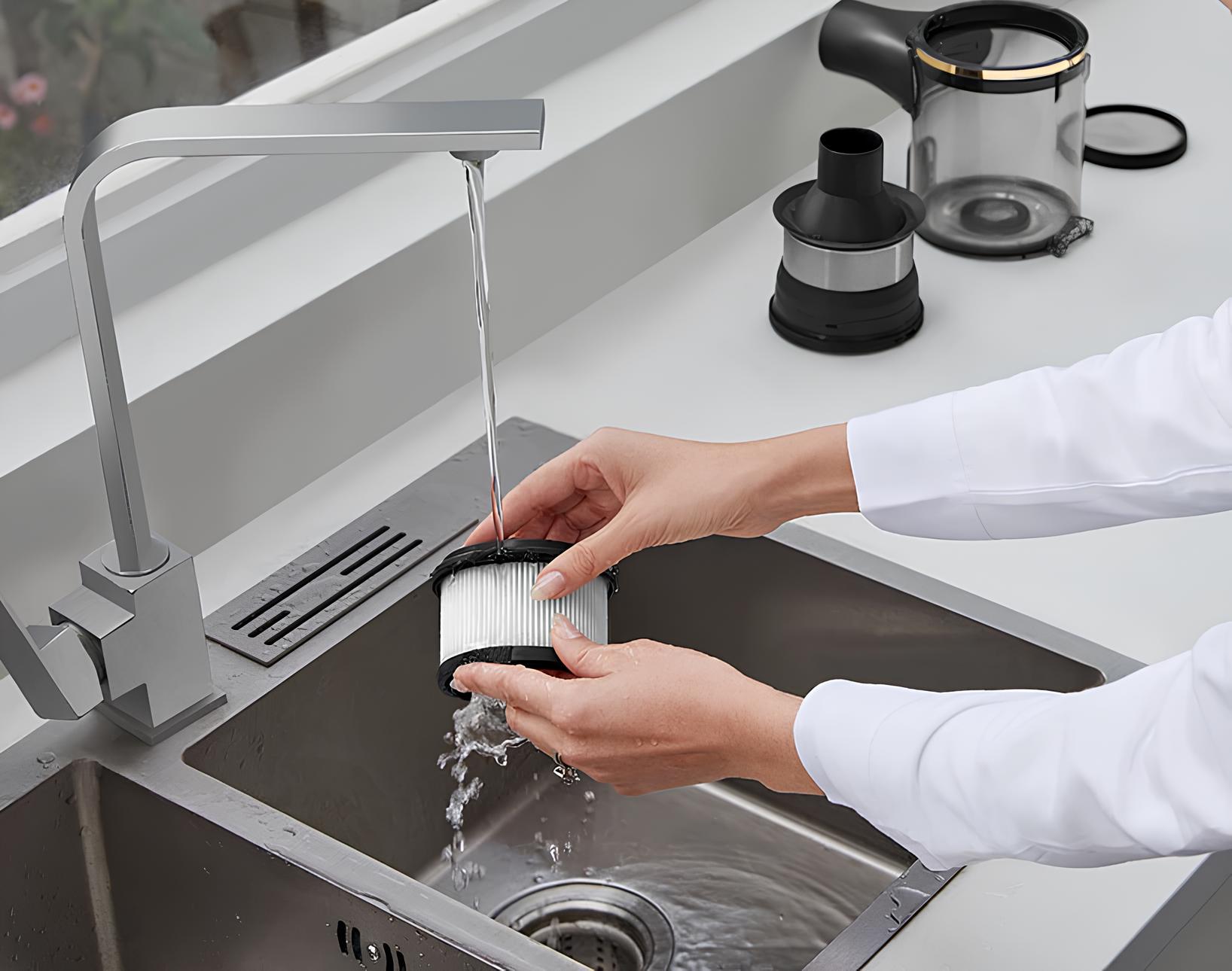Роликовая щетка, фильтр, контейнер для пыли и салфетки для швабры легко снимаются и моются, что упрощает обслуживание устройства.
